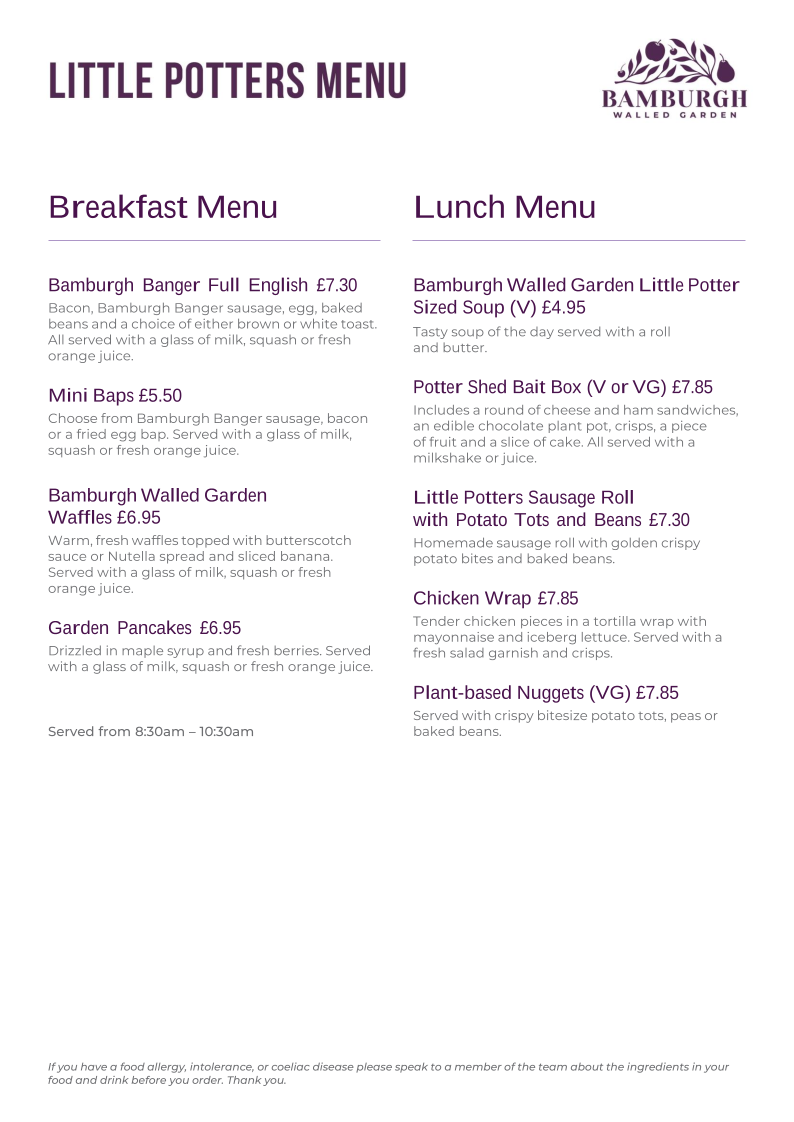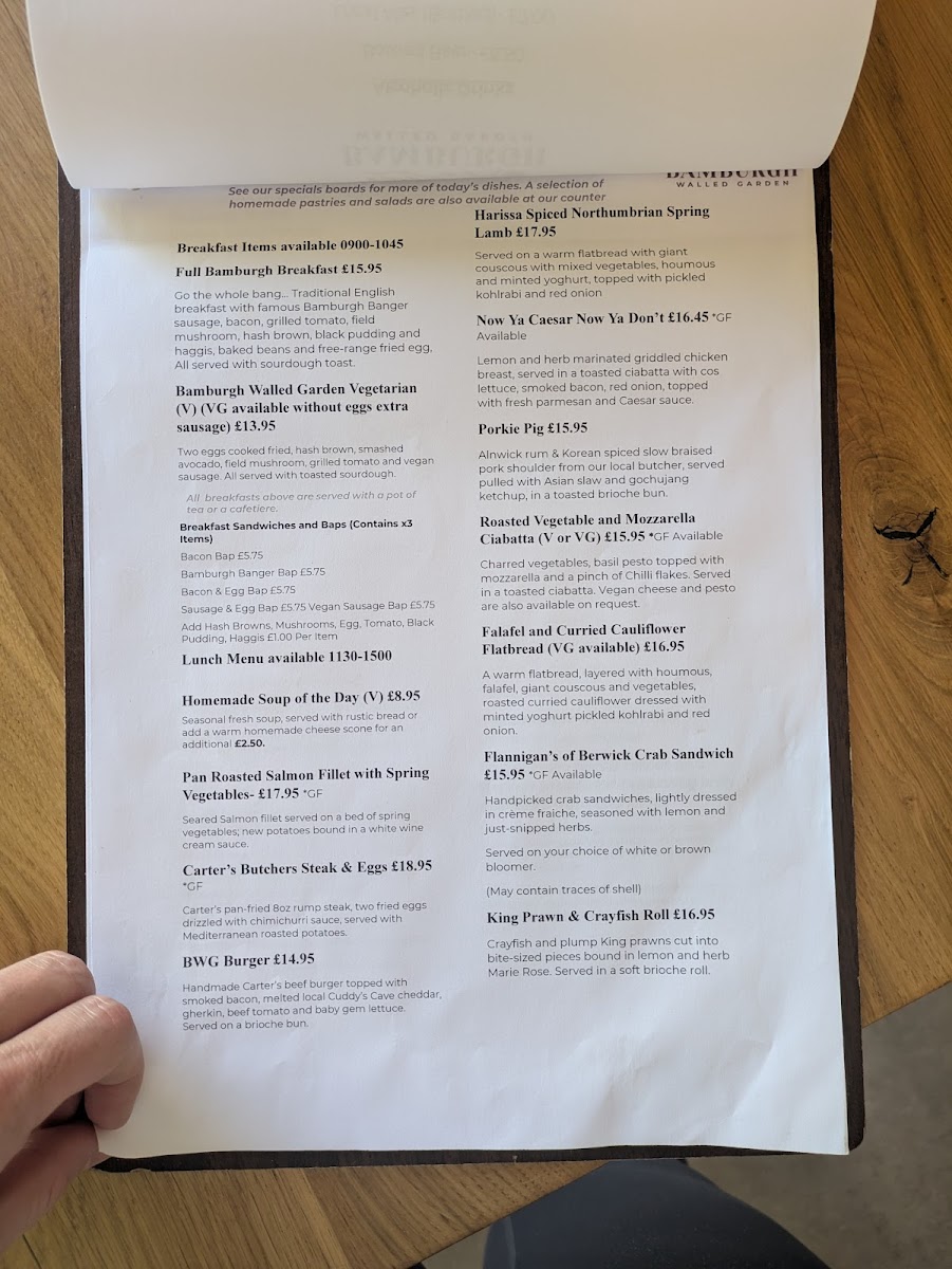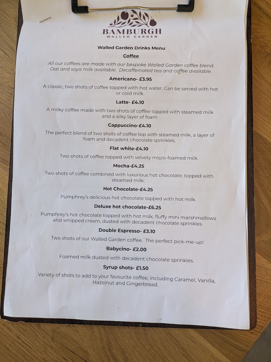 - Breakfast options are equally enticing, featuring the Bamburgh Banger Full English at £7.30 and Garden Pancakes at £6.95.