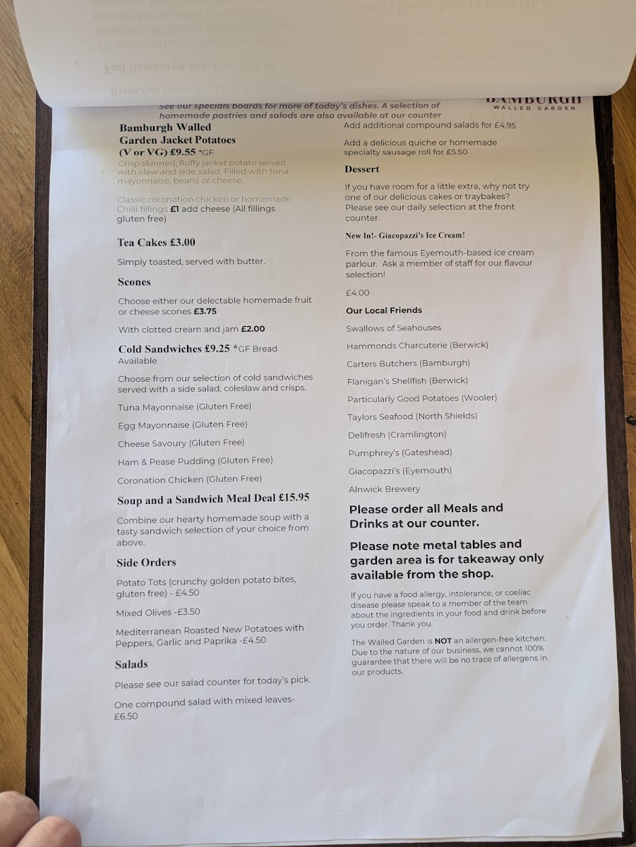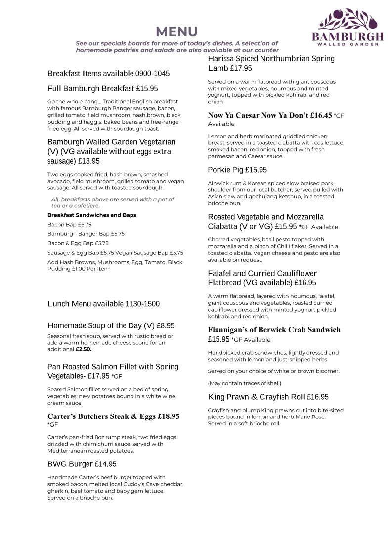 Welcome to the Bamburgh Walled Garden, an enchanting café nestled in the heart of Bamburgh, United Kingdom. This charming locale offers a delightful menu that showcases the essence of local culinary ingredients. From the robust Homemade Soup of the Day for £8.95 to the hearty Carter's Butchers Steak & Eggs at £18.95, there is something to satisfy every palate.